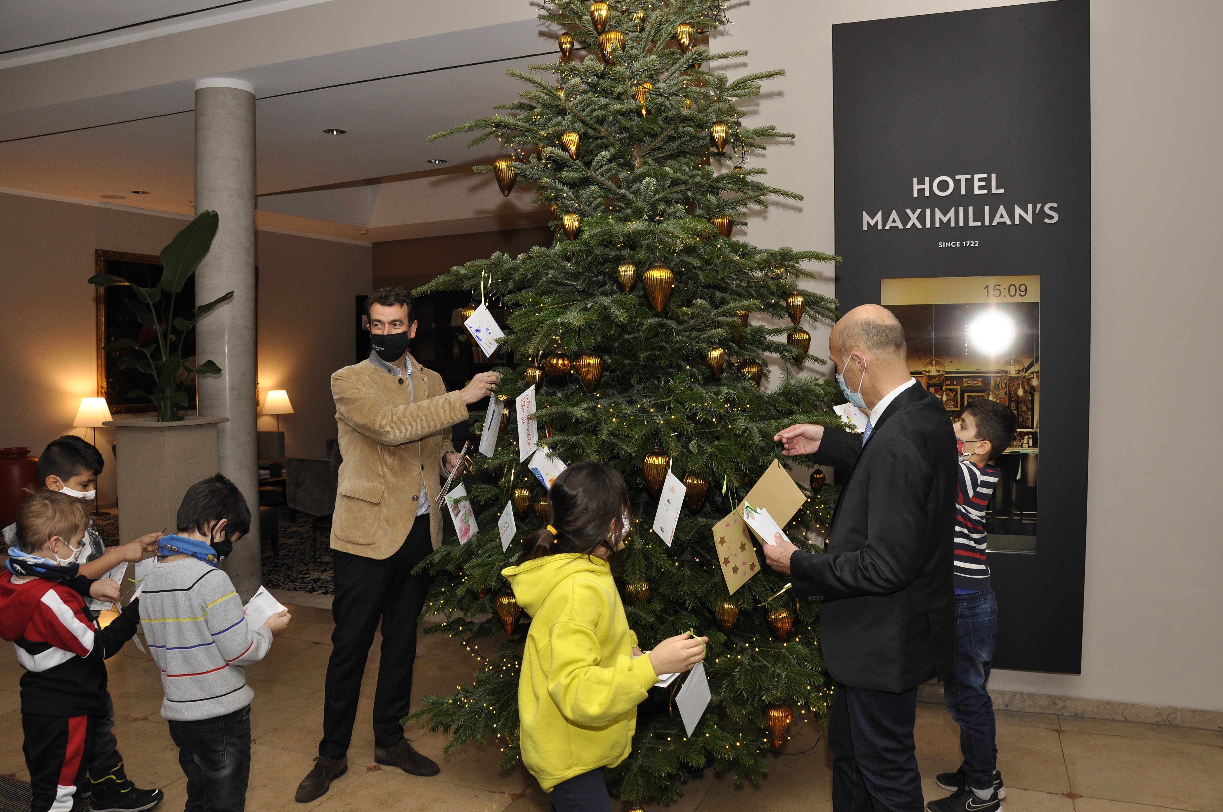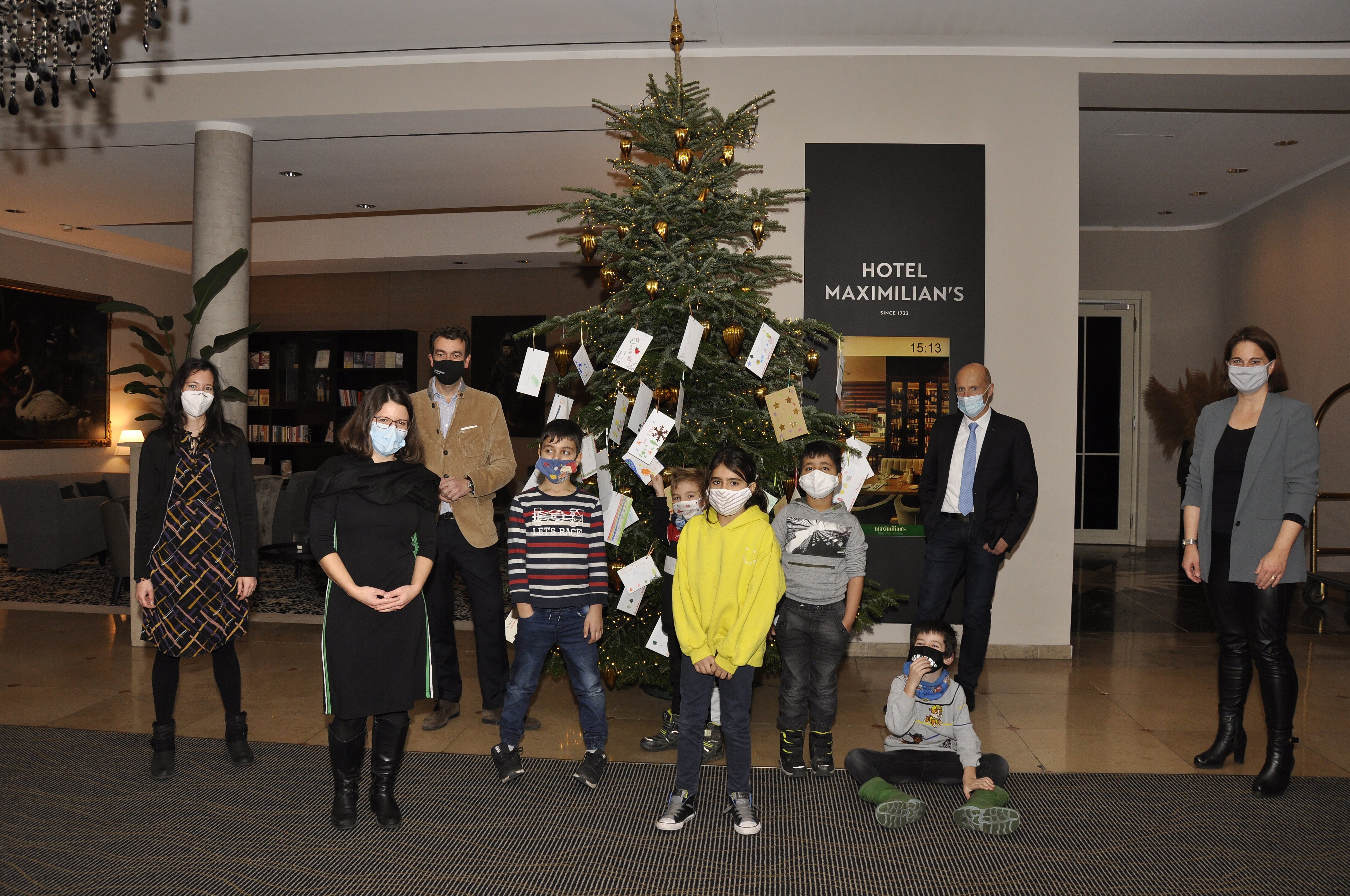„Bitte nimm mich“ steht auf einem mit grünen und roten Klebebändern verzierten Umschlag, der am Weihnachtsbaum in der Lobby des Hotels Maximilian’s hängt. Genau 50 solcher bunt bemalter und beschriebener Umschläge mit Wünschen von Kindern und Jugendlichen aus dem zur Katholischen Jugendfürsorge (KJF) Augsburg gehörenden Frère-Roger-Kinderzentrum haben Hoteldirektor Theodor Gandenheimer und Markus Mayer, Vorstandsvorsitzender der KJF Augsburg, zusammen mit Max (6), Sobhan (7), Maha (8), Alen (8) und Yanes (6) aufgehängt. Nun warten die Wünsche darauf von Augsburger Bürgern und Hotelgästen erfüllt zu werden.